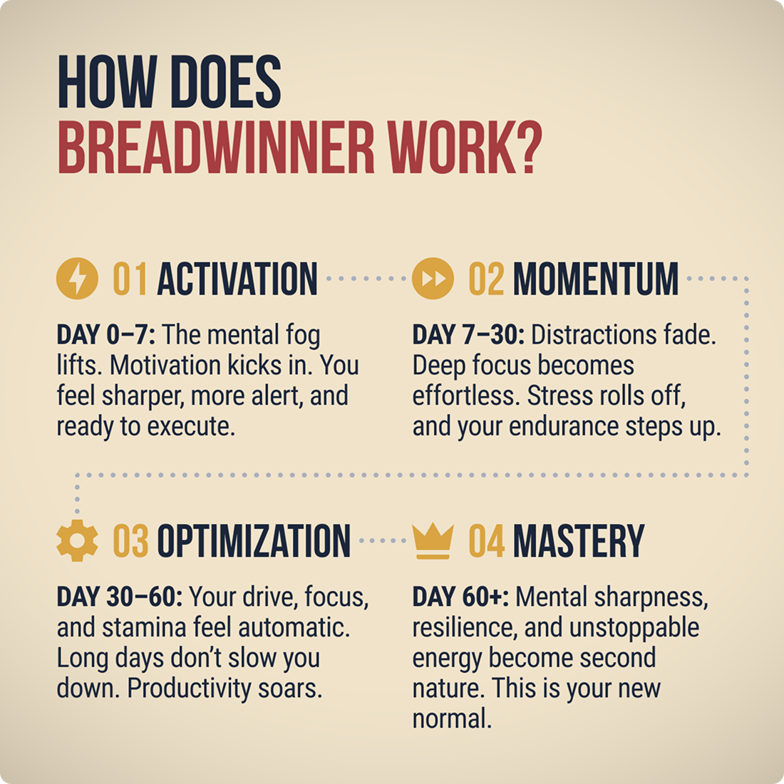 Without it, nothing moves forward. Breadwinner fires it up by boosting dopamine, turning ambition into action—and your dreams into reality.